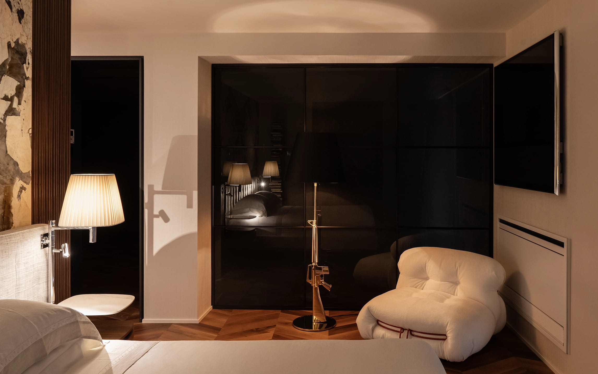 BedroomHomeProjectBedroom CREDITS:Marmi AntoliniLetto e poltroncine CassinaIlluminazione FlosTV Bang & Olufsen Scopri altro… KITCHEN LIVING ROOM BATHROOM OUTDOOR