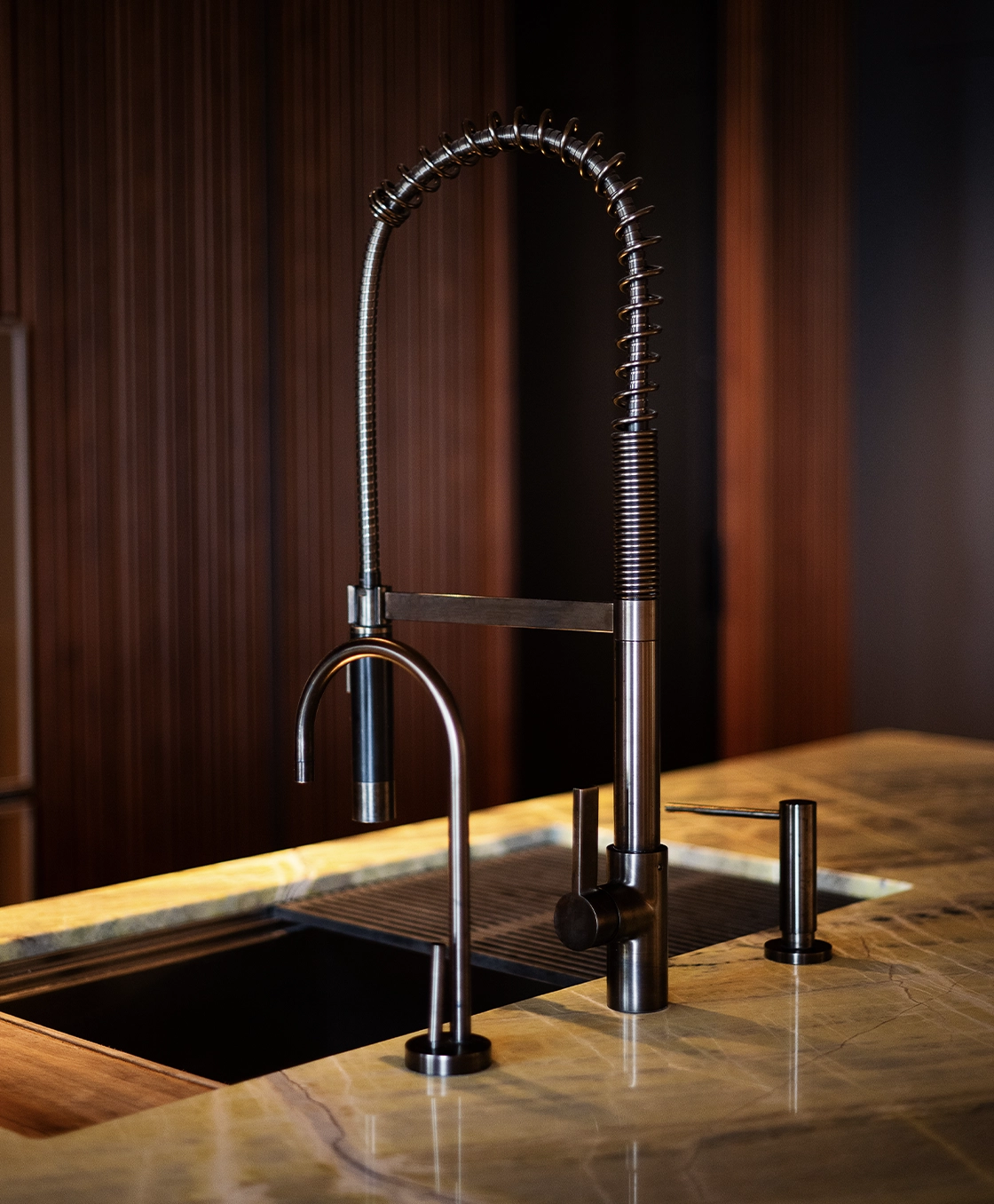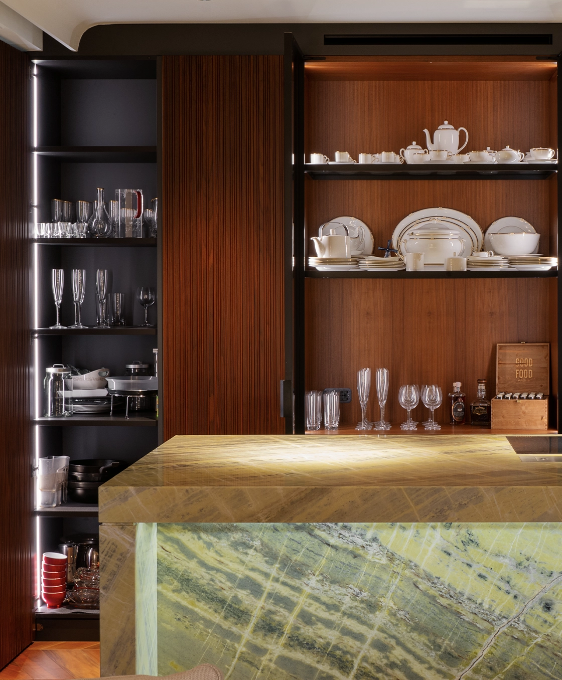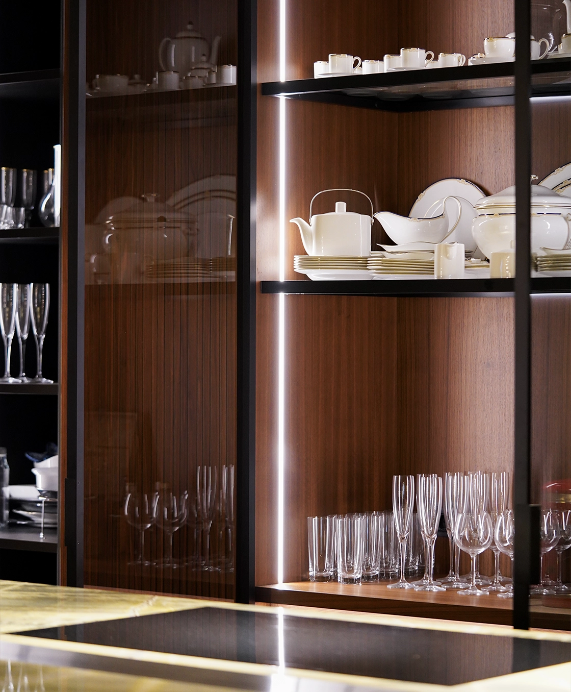 La parte contenitiva, realizzata in noce americano, è stata progettata per ottimizzare lo spazio e svolgere una doppia funzione: da un lato, conservare utensili, stoviglie, spezie ed essenze, dall’altro, nascondere con discrezione altre aree della casa, integrandosi perfettamente nell’arredamento. Un esempio di questa soluzione è l’anta con cerniere a scomparsa che, oltre a fungere da mobile della cucina, diventa una porta d’ingresso a un bagno di servizio nascosto.