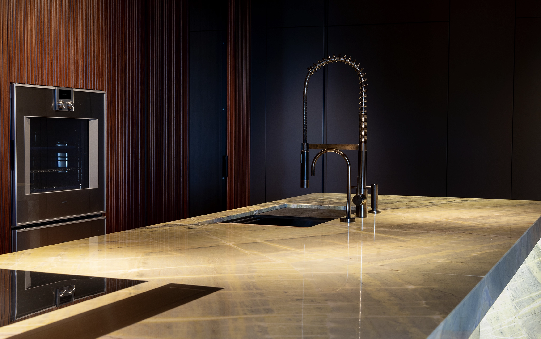 L’isola centrale è stata trattata con la tecnologia innovativa Azerocare Plus, che offre una protezione avanzata contro macchie e imperfezioni, assicurando durabilità e perfezione nel tempo. A completare il progetto, abbiamo scelto elettrodomestici della serie 400 di Gaggenau, noti per il loro design minimal e le prestazioni eccezionali, che si integrano perfettamente senza disturbare l’eleganza visiva della cucina.