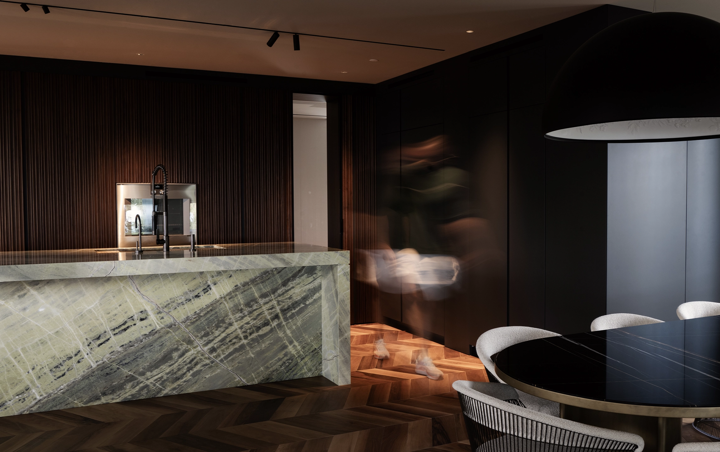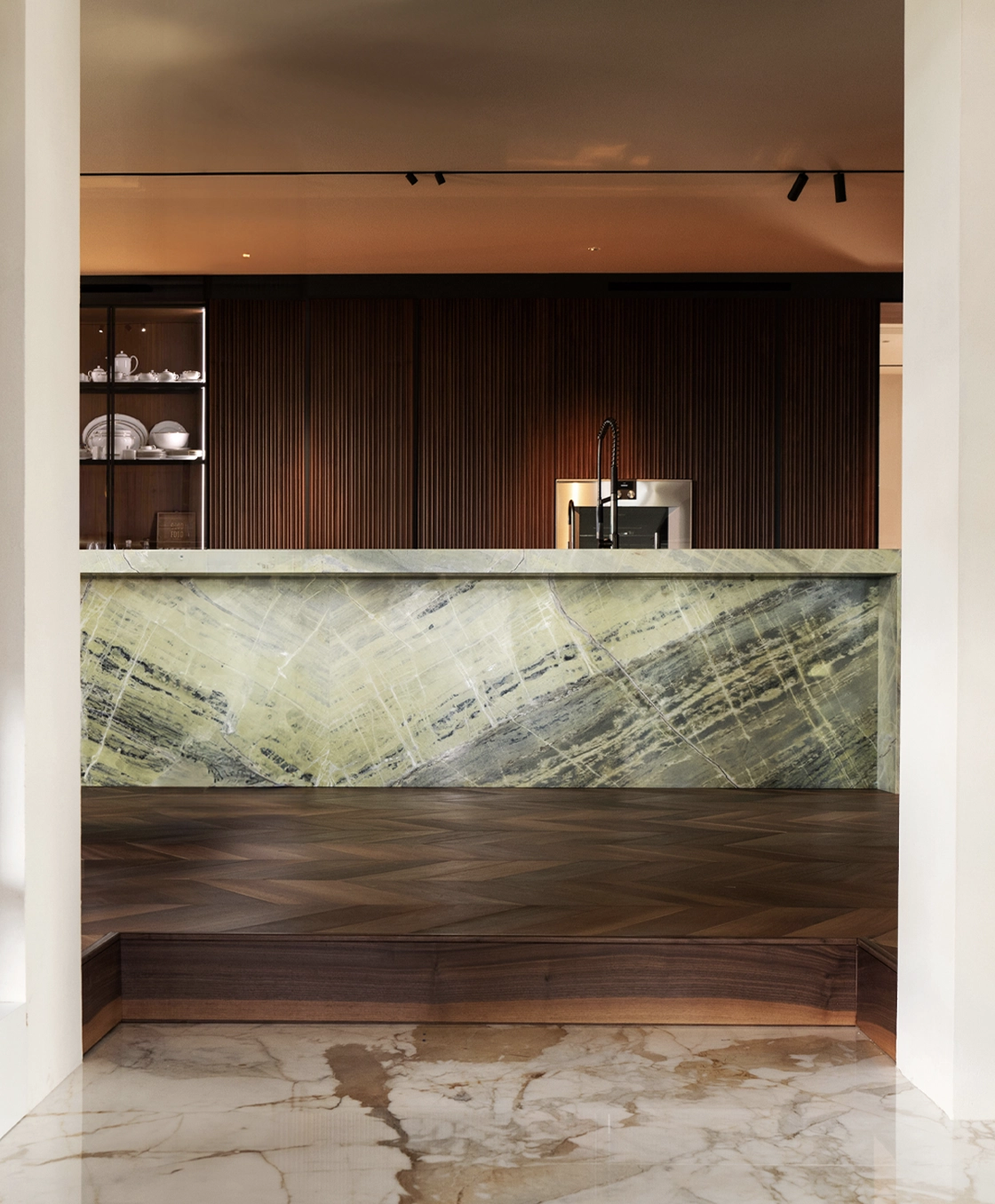 Per questo progetto, abbiamo scelto l’Irish Green di Antolini, una pietra naturale dai toni verdi, impreziosita da venature bianche, grigie e color mela. Per esaltare il suo aspetto unico, il fronte della cucina è stato illuminato con strip LED a 2700 gradi Kelvin, enfatizzando così le sfumature naturali del materiale.